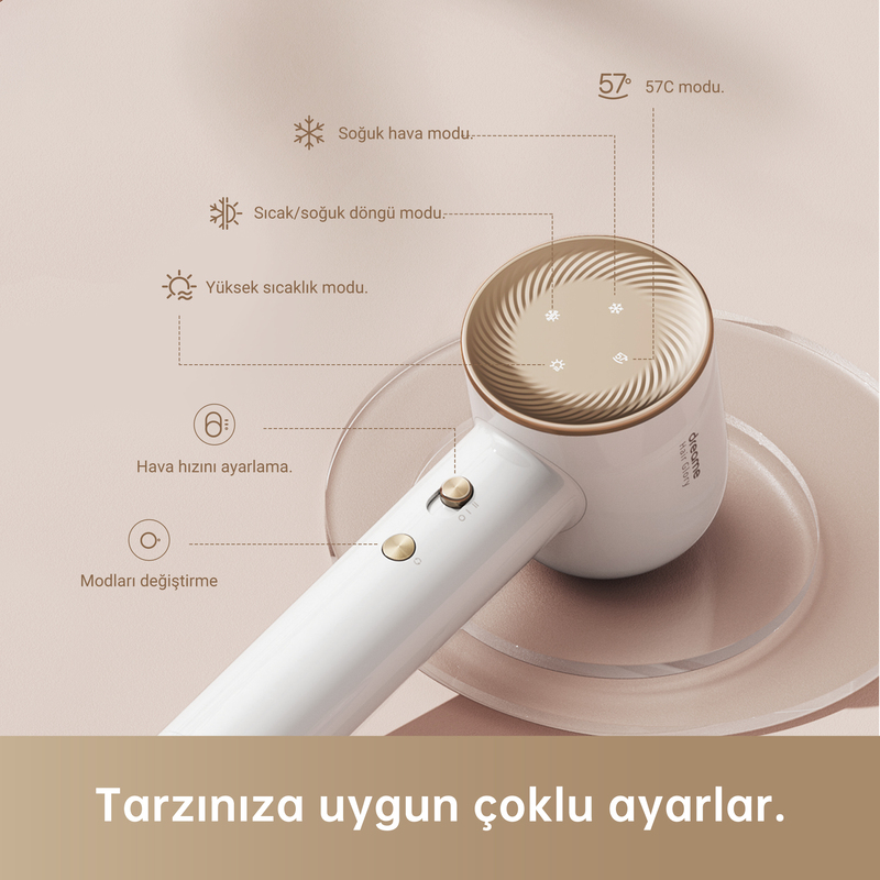 4 sıcaklık ayarı ve 2 hava akışı hızıyla saçınızı istediğiniz şekilde kolayca kurutun. Sıcak yaz günlerinde düşük sıcaklıkta kurutma için soğuk havaya, eşit sıcaklıkta hava ile kurutma için 57°C sabit sıcaklığa, hızlı kurutma için yüksek sıcaklığa ve bukle yapmak ya da saçlarınızı kabartmak için sıcak/soğuk döngüsüne geçin.