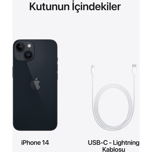 Ürün kutu içeriğinde teyp-C kablo türü bulunur. Şarj adaptörü, İphone 14 modeline ait kutu içeriğinde bulunmaz.