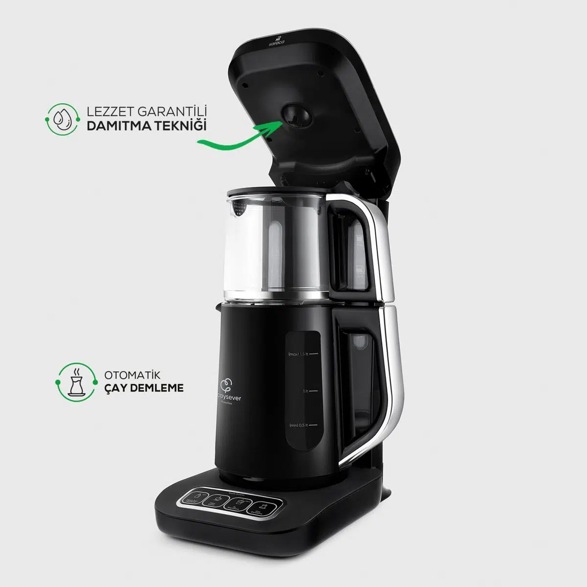 Çaysever Robotea Pro, “Otomatik Çay Demleme” özelliği sayesinde tek tuşla 15 dakikada çayınızı kendi kendine demler.