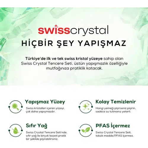 Swiss Crystal malzemesi Türkiye’de ilk kez Karaca Swiss Crystal tencerelerinin kaplamasında kullanılmıştır. PFAS bulunmadığı ILAG AG Switzerland laboratuvarında gerçekleştirilen 23-024/23-062 numaralı test ile onaylanmıştır. Akredite Kuruluşu tarafından ayrı ayrı olarak gerçekleştirilen yumurta, sebze ve kırmızı et yapışmazlık testlerinde 150-200 C arasında değişkenlik gösteren ısıda yağ eklenmeden ;yumurta (300 kez) kırmızı et(50 kez) ve sebze(50 kez) döngü ile test edilmiş ve yapışma gözlenmemiştir. Her döngü sonrası tava yüzeyi nemli peçete ile silinmiştir.