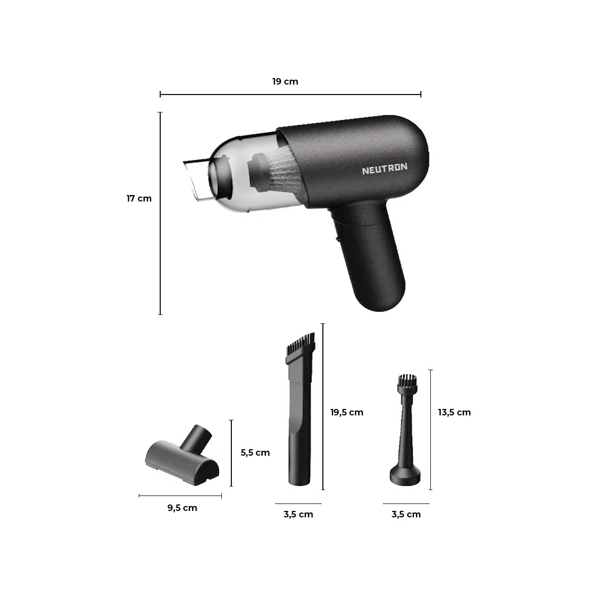 Çeşitli uç ve aksesuarlar, Neutron Mini'yi çok yönlü bir temizlik aracına dönüştürür. Koltuk araları, hava girişleri ve diğer zorlu noktalar artık temizlemesi zor değil!