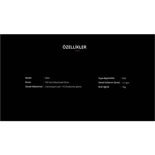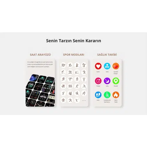Nabız - Stress- Kandaki Oksijen - Döngü - Uyku - Mesafe - Adım - Hareketsizlik hatırlarma - Kalori - Akıllı Kontrol - Telefonumu Bul - Mesaj Bildirimi - Müzik Kontrolü - Hava Durumu - Anlık Bildirim - Kamera Kontrolü